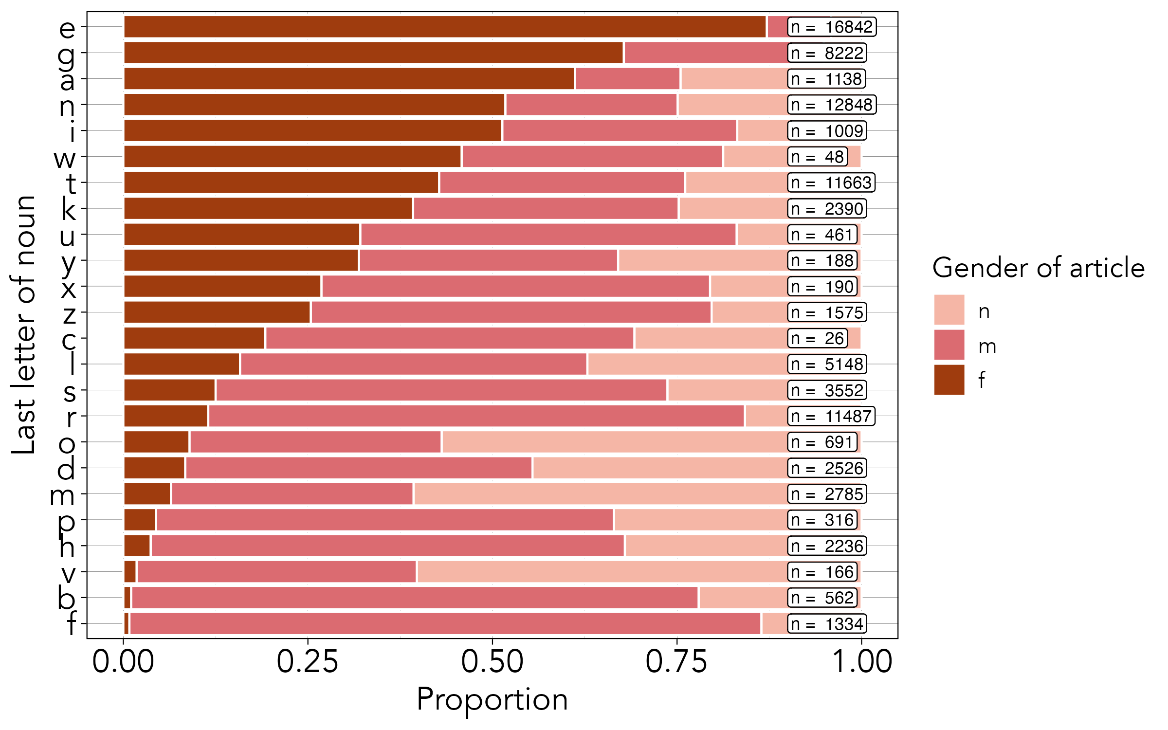 I defined a “heavy” bias as nouns whose final letter is associated with a particular article at a frequency of 85% or greater.