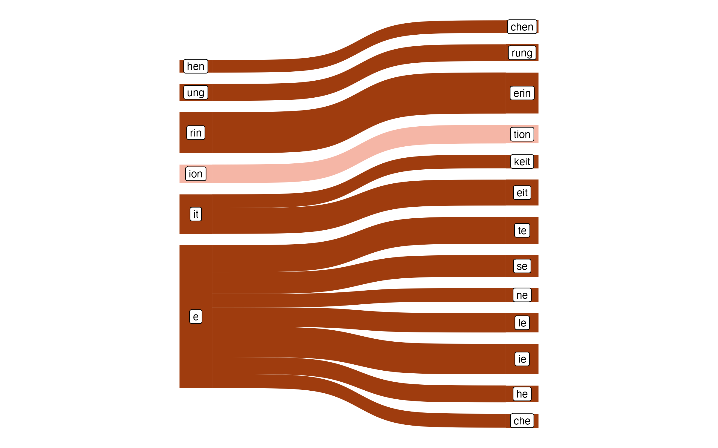 So now we have eight different rules to remember, which altogether cover 37.6% of our nouns. Some of these endings encompass multiple child suffixes that have the same or greater proportion of the article. We can use a sankey plot to check this out: