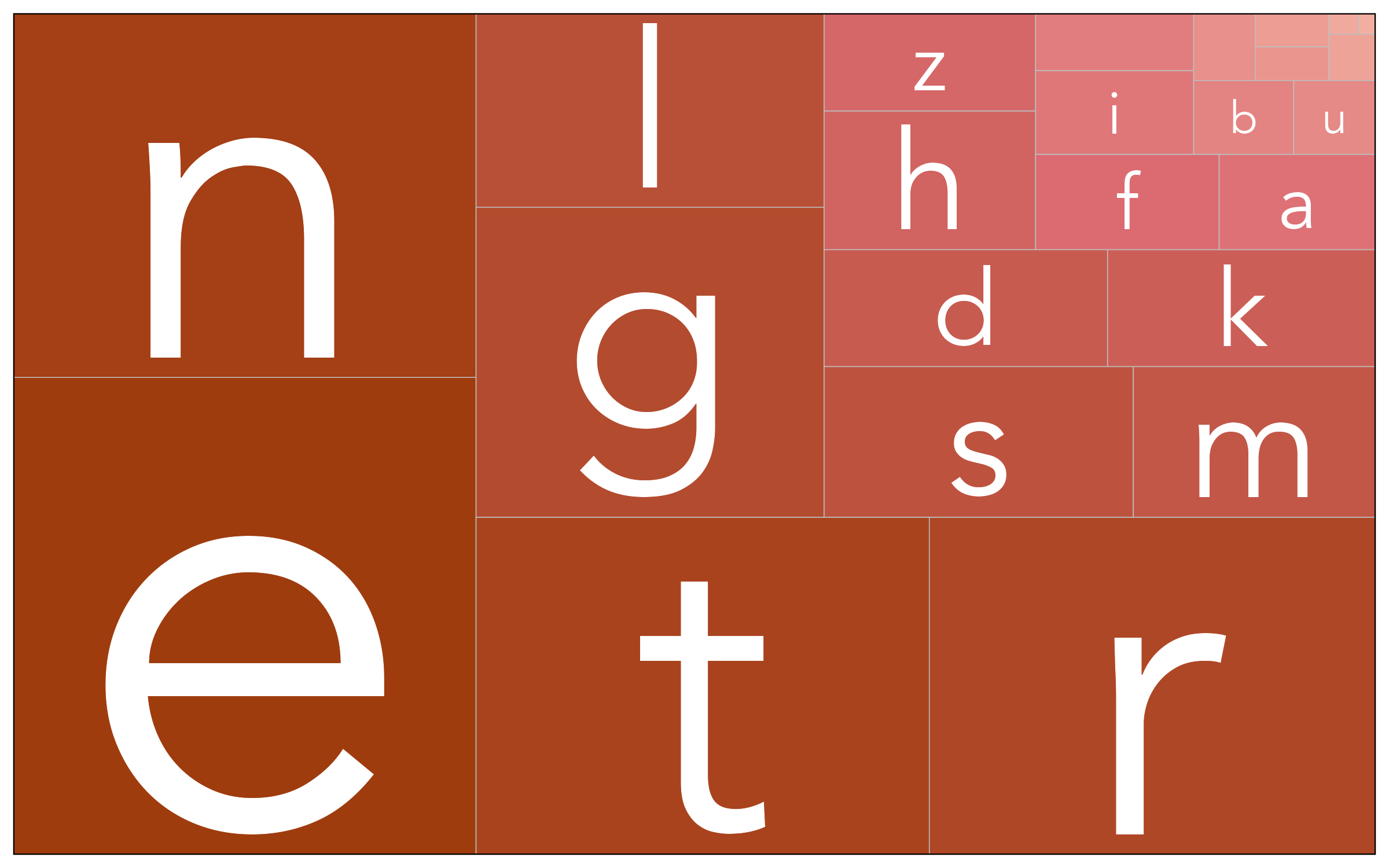 I extracted the last letter of each word, and first checked the proportion of nouns in each category. I’ll look at it with a treemap, where the size of each rectangle corresponds to the proportion of nouns in each category.